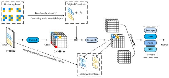 In the Equation (1), R, w, and x( + ) represent the coordinate set of the sampling position covered by the convolution, the weight of the convolution unit, and the pixel value of the ( + ) position, respectively. Given that the input feature map has dimensions (C, H, W), the corresponding offset can be obtained by convolution operation, and the dimension is (2N, H, W). Then, the offset is added to the original coordinate ( + ) to generate a new sampling coordinate corresponding to the convolution, and different sampling shapes are generated for the convolution at different positions in the feature map. Finally, the generated irregular convolution kernel is used to interpolate and resample the features of the new pixel position to obtain deeper feature information. In order to reduce the memory access frequency, the resampling, convolution calculation, and normalization process are merged into a sub-module in the LDConv module to reduce the storage steps.