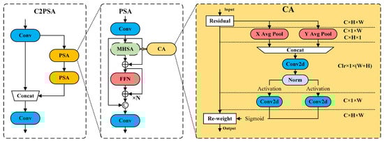 At the end of the backbone, partial self-attention (PSA) [37] relies on the built-in MHSA mechanism to provide multiscale representation capabilities for the model. However, the computational complexity of MHSA is high, especially on high-resolution images, and the ability to process local details is limited. This study proposes replacing the multihead self-attention mechanism with the CA mechanism, enabling the model to better capture spatial location information and channel-wise dependencies, thereby effectively handling complex background information in images. While maintaining a low parameter count, the introduction of CA allows the model to focus on more discriminative features and reduce interference factors in the decision-making process. The architecture of the CA mechanism is shown in Figure 7. One of the branches in the feature map of the input C2PSA flows to the CA, and the input feature map is globally pooled along both the horizontal and vertical axes. Each channel is encoded horizontally using a pooling kernel of size (H, 1), as shown in Equation (2). The size of the pooled nucleus in the vertical direction is (1, W), and the encoding process is as shown in Equation (3):