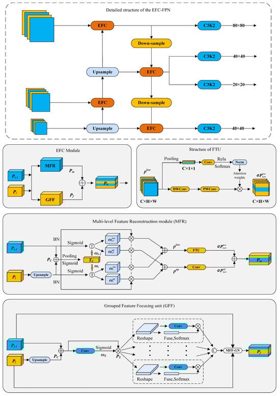 The role of FPN is to fuse the features of each layer of the neck network. The traditional FPN does not consider the correlation of the features of each layer when fusing the features, and some spatial information will be lost after fusion. In this study, the neck network was reconstructed according to the EFC lightweight fusion strategy and the new network was named EFC-FPN. The EFC module in the network is mainly composed of a multilevel feature reconstruction (MFR) module and a grouped feature focusing unit (GFF). The former reconstructs the small target features to reduce the loss of small target information in deep convolution, and the final output is shown in Equation (5). The latter enhances the correlation between different feature layers so that the model can better perceive the semantic information of small objects, and the final output is shown in Equation (6):