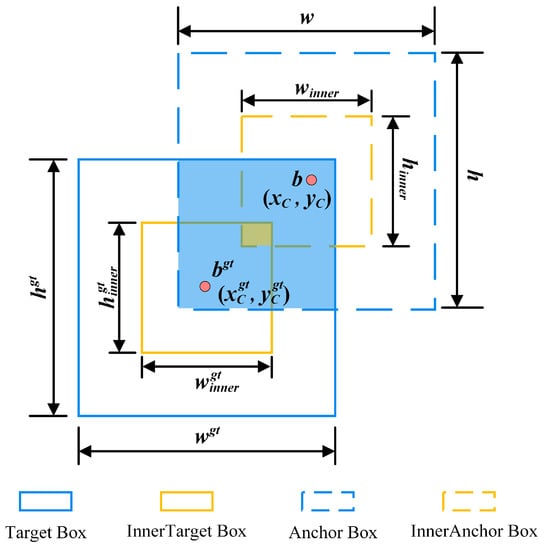 In the Equation (7), and represent the width and height of the target box, respectively, w and h denote the width and height of the anchor box, correspondingly, and v is used to measure the consistency of the aspect ratio of the two boxes. In the Equation (8), is the intersection and union ratio of the target box and the anchor box, and is a weight parameter. In the Equation (9), represents the Euclidean distance between the centers of the anchor box and the target box, and c denotes the diagonal length of the circumscribed rectangle of the anchor box and the target box. According to the relevant equation of CIoU, this loss function has some defects. For example, when the aspect ratio of the anchor box and the target box is consistent, the weight parameter a will fail, causing the sensitivity degradation of the loss function. When detecting small targets, due to the size of the anchor box and the target box being close, the gap between the aspect ratio is very small, so CIoU can not locate the small target well. In this study, Inner CIoU proposed by H Zhang et al. [38] was used as the loss function to solve the defects in CIoU. The principle of Inner IoU is shown in Figure 9. On the basis of CIoU, Inner CIoU introduces the auxiliary bounding boxes: InnerTarget Box and InnerAnchor Box with widths of and and heights of and , respectively. The intersection and union ratio between the auxiliary bounding boxes is denoted as . The auxiliary box introduced shares the geometric centers and with the original boundary box. When the weight parameter fails, the auxiliary box can make up for the sensitivity loss of the loss function through scale transformation. The definition of Inner CIoU is shown in Equation (10):