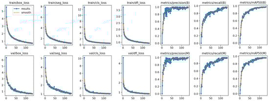 As shown in Figure 11, box loss and dfl loss represent the loss value between the anchor box and the target box. The smaller the loss value, the more accurate the detection result. Seg loss represents the loss value of the mask coverage area. The smaller the loss value, the more accurate the segmentation result. Cls loss represents the loss value of the classification. The smaller the loss value, the higher the recall of the sample. During training, the four loss values of the model gradually decreased with one iteration. When the factor value was 1.5, the loss value decreased the most, and the convergence value was the smallest. It can be seen that the convergence speed of the model was the fastest. In addition, this study compares the effects of four values of the on the performance of the model. The experimental results are shown in Table 3.