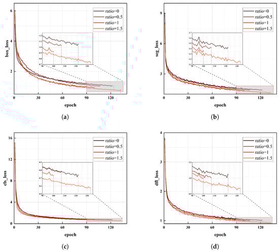 Inner CIoU uses a scaling factor to regulate the dimensions of the auxiliary bounding box. The transformation center is defined by the centers of both the anchor frame and the target frame. When the is less than 1, scaling is performed, and when the is greater than 1, expansion is performed. Generally, the value range of the factor is [0.5, 1]. This study compares the changes in the convergence speed of the model in the four values of , as shown in Figure 11.