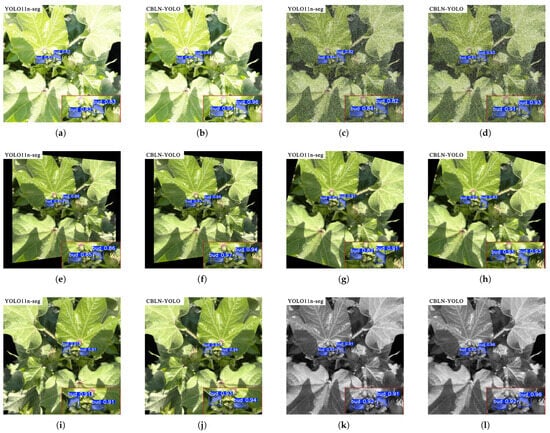 Segmentation effect of YOLO11n-seg and CBLN-YOLO on the cotton top bud dataset (lower-right corner of the image is the enlarged image of the top bud): (a) YOLO11n-seg segments random brightness-enhanced images; (b) CBLN-YOLO segments random brightness-enhanced images; (c) YOLO11n-seg segments noise-processed images; (d) CBLN-YOLO segments noise-processed images; (e) YOLO11n-seg segments images after tangential transformation; (f) CBLN-YOLO segments images after tangential transformation; (g) YOLO11n-seg segments images after random rotation; (h) CBLN-YOLO segments images after random rotation; (i) YOLO11n-seg segments mirrored images; (j) CBLN-YOLO segments mirrored images; (k) YOLO11n-seg segments grayscale images; (l) CBLN-YOLO segments grayscale images.