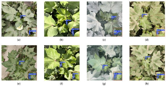 Experimental results of cotton top bud segmentation in the field (lower-right corner of the image is the enlarged image of the top bud): (a) uncovered top buds collected in sunny morning; (b) uncovered top buds collected in sunny noon; (c) uncovered top buds collected in dusty morning; (d) uncovered top buds collected in dusty noon; (e) covered top buds collected in sunny morning; (f) covered top buds collected in sunny noon; (g) covered top buds collected in dusty morning; (h) covered top buds collected in dusty noon.