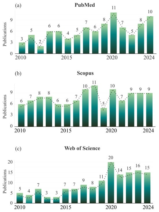 Publication trends in bioaerosols (2010–2024). Data were collected from (a) PubMed, (b) Scopus, and (c) Web of Science using the search terms “bioaerosols” AND “agriculture”. All publication types were included with no restrictions. Bar plots were created with the ggplot2 R package (v3.5.0).