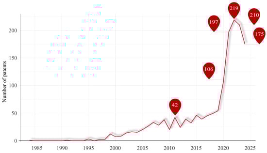 Bioaerosol sampling is crucial for their investigation [183,184,185,186]. Patents for bioaerosol collection have been increasing since 1982, with a significant surge in 2022, reaching 203 methods (Figure 5), mainly due to the COVID-19 pandemic in 2019, which increased the urgency to study these particles. The designs of these sampling devices vary widely; for example, one system uses a box on a vehicle seat for automatic monitoring [184], while another employs atomizing nozzles, sterilization, and drying for accurate fluorescence analysis [183]. Generally, the primary objective is to extract a representative sample from the air for further analysis using specific techniques [185,186]. The aerodynamic diameter of particles, which indicates their size based on a density of 1 g/cm3, is crucial for determining how particles move and are collected [187].
