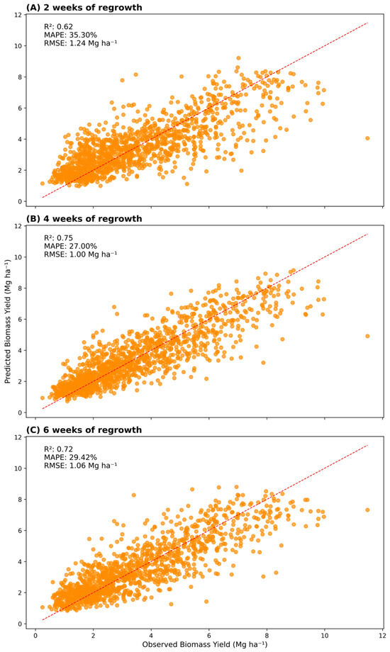 All-features models’ scatterplots contrasting the observed and predicted biomass yield (Mg ha−1), and presenting the coefficient of determination (R2), mean absolute percentage error (MAPE), and root mean square error (RMSE) at 2 (A), 4 (B), and 6 (C) weeks of regrowth. The orange dots represent each observation point.