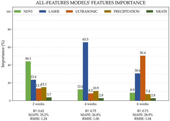 At 4 WOR, laser became the most important feature, followed by NDVI, precipitation, ultrasonic, and N rate. At this stage, the plants were mid-vegetative, and the canopy was not completely closed [40], allowing the laser to play a key role in assessing height and potential vegetation cover gaps. The laser has a 4.8 mm diameter reading spot that precisely distinguishes bare soil, i.e., “zero”, from canopy height [41].
