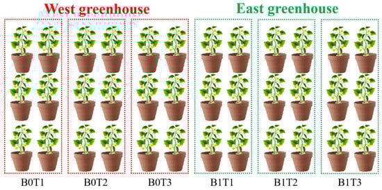 In order to study the effects of downy mildew (It is caused by the infection of Pseudoperonospora cubensis) and potassium on the photosynthesis, plant height, stem diameter, leaf area and root parameters of cucumber in a greenhouse, as shown in Figure 1, the experimental design consisted of 6 treatments, each of which was repeated 6 times. B0 indicates that cucumber plants are infested with downy mildew. B1 indicates that cucumber plants are free of downy mildew. The application rates of potassium fertilizer were T1 (K-50%), T2 (K-100%) and T3 (K-150%). Therefore, the six experimental treatments were B0T1 (cucumber plants with downy mildew infestation and 50% of the normal application of potassium fertilizer), B0T2 (cucumber plants with downy mildew infestation and the normal application of potassium fertilizer) and B0T3 (cucumber plants with downy mildew infestation and 150% of the normal application of potassium fertilizer), and B1T1 (cucumber plants without frost mildew infection; the potassium fertilizer application rate was 50% of normal fertilizer), B1T2 (cucumber plants did not have downy mildew infection; the potassium fertilizer application rate was normal) and B1T3 (cucumber plants did not have downy mildew infection; the potassium fertilizer application rate was 150% of the normal fertilizer rate). In order to avoid the spread of downy mildew between cucumber plants, the infected cucumber plants were cultivated in the western greenhouse, and the non-infected cucumber plants were cultivated in the eastern greenhouse. The ridge spacing of cucumber plants was 32 cm and the plant spacing was 50 cm. In addition, 400 mL of nutrient solution was poured on the experimental cucumber plant samples from 8:00 am to 9:00 am every day during the experimental treatment. The formula of the nutrient solution is shown in Table 1.