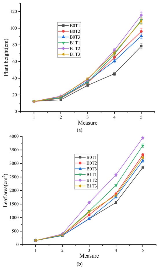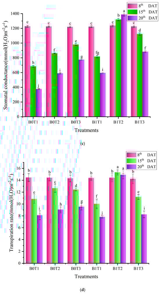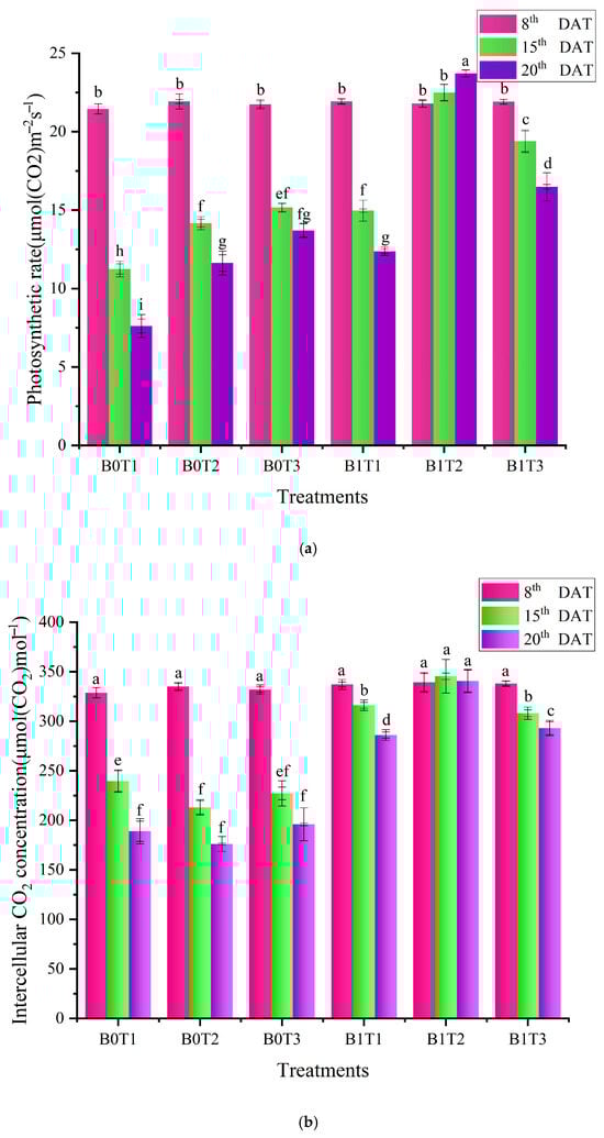 As can be seen from Figure 2a, on the 15th day after the transplantation of cucumber plants, the leaf photosynthetic rate of plants treated with B0T1, B0T2, B0T3, B1T1 and B1T3 decreased by 50%, 37%, 32.56%, 33.46% and 13.78%, respectively, compared with the experimental treatment with B1T2. On the 20th day after transplantation, the photosynthetic rate of cucumber leaves treated with B0T1, B0T2, B0T3, B1T1 and B1T3 decreased by 67.89%, 50.94%, 42.19%, 47.8% and 30.47%, respectively, compared with the experimental treatment with B1T2. On the 15th and 20th days after transplantation, there was no significant difference in the photosynthetic rate of cucumber leaves treated by B0T2 and B1T1. As can be seen from Figure 2b, on the 15th day after the transplantation of cucumber plants, the intercellular CO2 concentration in the leaves of cucumber plants treated with B0T1, B0T2, B0T3, B1T1 and B1T3 decreased by 30.64%, 38.31%, 34.23%, 8.49% and 10.8%, respectively, compared with the experimental treatment with B1T2. On the 20th day after transplantation, the intercellular CO2 concentration of cucumber leaves treated with B0T1, B0T2, B0T3, B1T1 and B1T3 decreased by 44.52%, 48.31%, 42.48%, 16.01% and 13.97%, respectively, compared with that treated with B1T2. On the 15th and 20th days after transplantation, there was no significant difference in the intercellular CO2 concentration of cucumber leaves treated by B0T2 and B0T3. As can be seen from Figure 2c, on the 15th day after the transplantation of cucumber plants, the stomatal conductance of the leaves of cucumber plants treated with B0T1, B0T2, B0T3, B1T1 and B1T3 decreased by 48.09%, 34.71%, 25.72%, 38.1% and 14.92%, respectively, compared with the experimental treatment with B1T2. On the 20th day after transplantation, the stomatal conductance of cucumber leaves treated with B0T1, B0T2, B0T3, B1T1 and B1T3 decreased by 72.87%, 57.48%, 44.12%, 57.07% and 36.35%, respectively, compared with B1T2. There was no significant difference in stomatal conductance between B0T2 and B1T1 on the 15th and 20th days after transplantation. As can be seen from Figure 2d, on the 15th day after the transplantation of cucumber plants, the leaf transpiration rate of cucumber plants treated with B0T1, B0T2, B0T3, B1T1 and B1T3 decreased by 29.26%, 17.49%, 18.95%, 34.62% and 27.11%, respectively, compared with the experimental treatment with B1T2. On the 20th day after transplantation, the transpiration rate of cucumber leaves treated with B0T1, B0T2, B0T3, B1T1 and B1T3 decreased by 45.67%, 39.2%, 36.01%, 47.56% and 44.73%, respectively, compared with B1T2. On the 15th and 20th days after transplantation, there was no significant difference in the leaf transpiration rate between B0T1 and B1T3.
