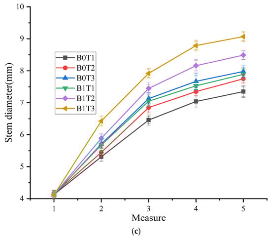 The parameters of plant height, stem diameter and leaf area of cucumber were measured five times during the experiment. The tests were conducted on the 8th, 11th, 14th, 17th and 20th days after the transplantation of cucumber plants. The effects of potassium treatment and downy mildew infection on the plant height, stem diameter and leaf area of cucumber are shown in Figure 3. The plant height, stem diameter and leaf area had different responses to different potassium treatments and downy mildew infection. As can be seen from Figure 3, on the 20th day after the transplantation of cucumber plants, the plant height of cucumbers treated with B0T1, B0T2, B0T3, B1T1 and B1T3 decreased by 32.21%, 16.93%, 21.59%, 53.54% and 6.31%, respectively, compared with that treated with B1T2. The growth rate of cucumber plants treated with B1T2 was significantly higher than that of other treatments from the fourth measurement, while the growth rate of cucumber plants treated with B0T1 was always lower than that of other treatments. On the 20th day after transplantation, the leaf area of cucumbers treated with B0T1, B0T2, B0T3, B1T1 and B1T3 decreased by 27.85%, 15.97%, 21.47%, 7.29% and 18.5%, respectively, compared with that treated with B1T2. From the second measurement, the leaf area of cucumber plants treated with B1T2 was larger than that of other treatments. The leaf area of cucumber plants treated with B0T1 was always smaller than that treated with other treatments. The leaf area sizes of cucumber plants treated with B0T3, B1T3 and B0T2 were similar, but lower than that treated with B1T1. On the 20th day after transplantation, the stem diameter of cucumbers treated with B0T1, B0T2, B0T3 and B1T1 decreased by 13.43%, 8.72%, 6.01% and 7.06%, respectively, compared with that treated with B1T2. The stem diameter of cucumbers treated with B1T3 increased by 6.83% compared with that treated with B1T2. From the second measurement, the stem diameter of cucumber plants treated with B1T3 was always larger than that of other treatments. The stem diameter of cucumber plants treated with B0T1 was always smaller than that of other treatments. The stem sizes of B0T3-, B1T1- and B0T2-treated cucumber plants were similar, but lower than that of B1T2-treated cucumber plants.