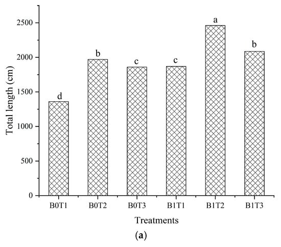 The effects of potassium stress and downy mildew infection on the root parameters of cucumber are shown in Figure 4. The root total length, root surface area, root average diameter, root total volume and total root tips of cucumber plants were significantly different under different experimental conditions (p < 0.05). As can be seen from Figure 4, on the 20th day after transplantation, the root total length of cucumber plants treated with B0T1, B0T2, B0T3, B1T1 and B1T3 decreased by 44.73%, 19.94%, 24.43%, 24.1% and 15.18%, respectively, compared with that treated with B1T2. The root surface area of cucumber plants treated with B0T1, B0T2, B0T3, B1T1 and B1T3 decreased by 63.98%, 36.19%, 18.82%, 31.27% and 2.22%, respectively, compared with that treated with B1T2. The root average diameter of cucumber plants treated with B0T1, B0T2, B0T3 and B1T1 decreased by 61.67%, 50.22%, 23.04% and 30.03%, respectively, compared with that treated with B1T2. The root average diameter of cucumber plants treated with B1T3 was increased by 12.07% compared with that treated with B1T2. The root total volume of cucumber plants treated with B0T1, B0T2, B0T3, B1T1 and B1T3 decreased by 51.46%, 37.14%, 19.97%, 25.07% and 2.85%, respectively, compared with that treated with B1T2. The total root tips of cucumber plants treated with B0T1, B0T2, B0T3, B1T1 and B1T3 decreased by 54.48%, 43.91%, 53.86%, 27.41% and 23.07%, respectively.