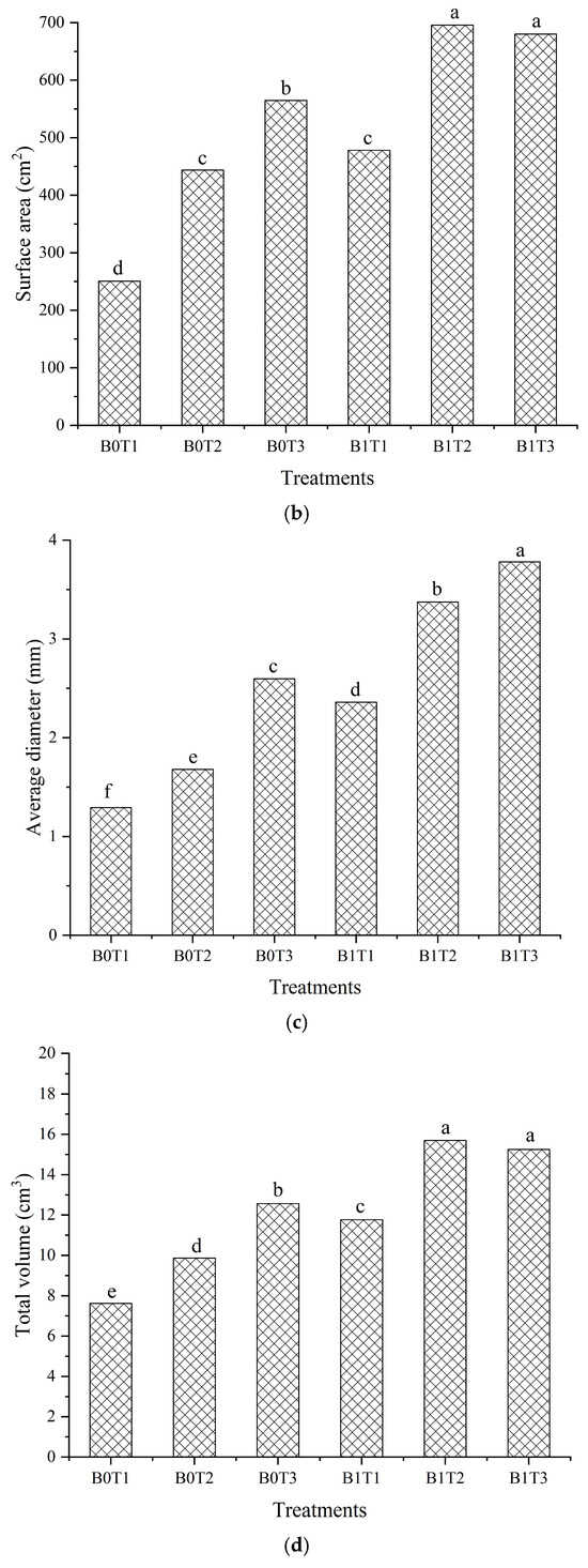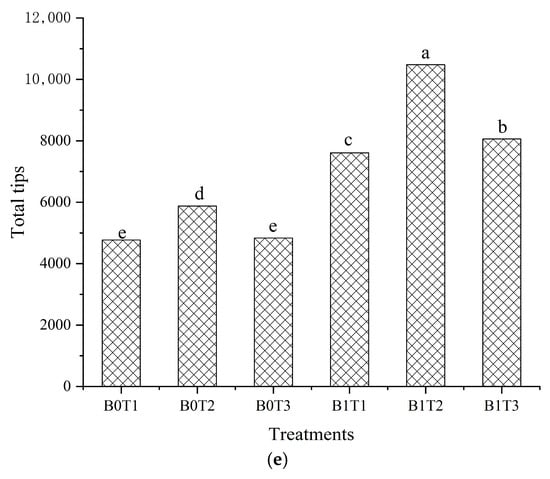 Root system parameters of cucumber plant. Note: Error bars indicate standard deviations, with different lowercase letters between treatments indicating significant differences at (p < 0.05). (a) Total length; (b) surface area; (c) average diameter; (d) total volume; (e) total tips.