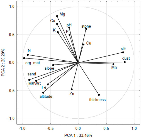 The decisive range of variability in the PCA calculations for topographic factors, physical properties of soil and soil macro- and micro-nutrient concentrations is defined by the first two components, for which eigenvalues of 6.36 and 3.84, respectively, were recorded. They explain 33.46% and 20.20% of the total variance, respectively. The obtained results are presented in Figure 1. There is a notable negative correlation between potassium and magnesium concentrations in the soil and soil thickness, a positive correlation between iron and hypsometric height, a positive correlation between calcium and manganese and slope inclination, positive correlations between calcium and magnesium concentrations in the soil, a negative correlation between zinc and soil pH, positive correlations between calcium, magnesium and iron concentrations in the soil and a negative correlation between manganese and organic matter, negative correlations between iron and dust and clay, positive correlations with sand fraction and total nitrogen in the soil, a positive correlation between manganese and clay and a negative correlation with nitrogen (Table 1).