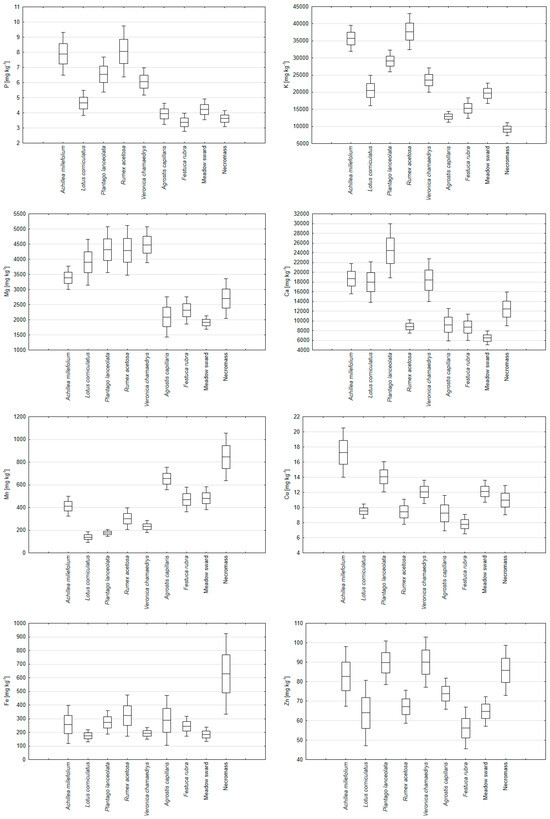 The concentrations of the analyzed elements in above-ground plant shoots and meadow sward are presented in graphs (Figure 2). Dicotyledon herbs contained more calcium, phosphorus, potassium, magnesium and, with the exception of Rumex acetosa, calcium. In the case of manganese and iron (excluding Rumex acetosa and Achillea millefolium), inverse correlations were noted. The results show high contents of manganese, iron and zinc in the plant necromass.