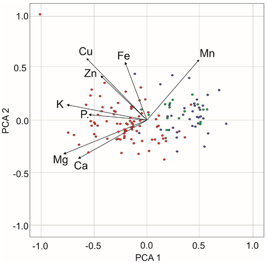 Principal component analysis (PCA) prepared for the concentration of macro- and micro-nutrients in the functional groups studied. Red color indicates forbs; blue—grasses; green—sward.