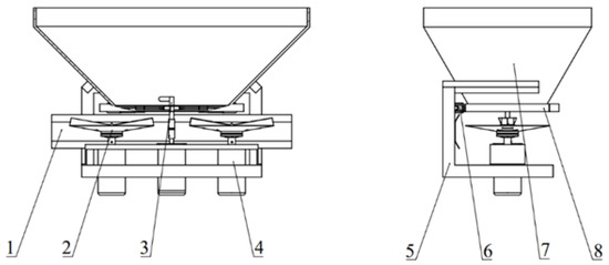 Fertilizer spreader simulation model. 1. Fertilizer spreading baffle; 2. Fertilizer spreading disc; 3. Stirring dragon; 4. DC motor; 5. Fertilizer spreader bracket; 6. Electric push rod; 7. Fertilizer box; 8. Fertilizer discharge mechanism.