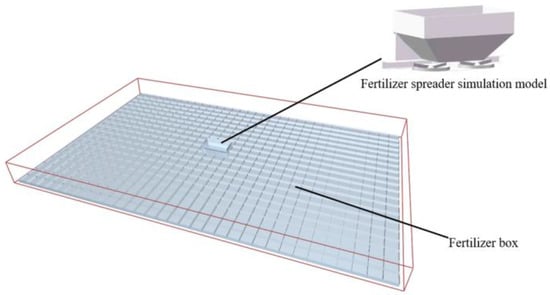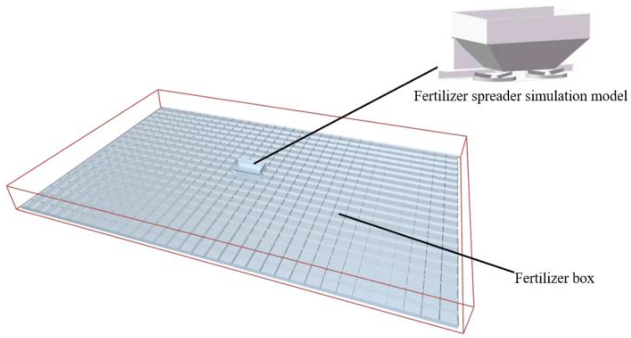 A 16 m × 10 m virtual spreading region was established in EDEM. The region contained 640 fertilizer collection boxes (500 mm × 500 mm × 150 mm each), arranged in a 20-row by 32-column grid, as shown in Figure 3. After each simulation, the vertical accumulation of fertilizer particles in each column of boxes was recorded, resulting in a horizontal distribution across 32 longitudinal units.