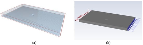 Models in EDEM and models: (a) The setting of fertilizer collection box in EDEM virtual fertilizer spreading area in coupling simulation; (b) Fluent wind field simulation setting in coupling simulation.