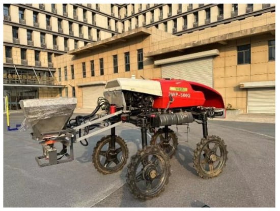 To validate the accuracy of the EDEM-CFD simulation, a prototype was manufactured based on the optimized simulation results. Key components of the fertilizer spreader were fabricated and assembled into a complete system. A brushed direct current motor was used to control the rotational speed of the fertilizer disc and mounted on the rear of an unmanned, self-propelled, high-clearance wheeled chassis, as shown in Figure 5. The prototype parameters are shown in Table 5.