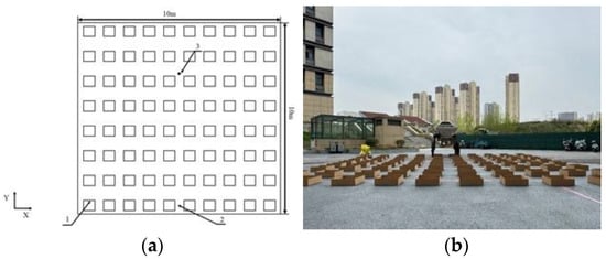 In this test zone, the Y-axis was defined as the forward direction of machine movement along the ground. The X-axis was defined as the direction perpendicular to the Y-axis on the same ground plane. Fertilizer collection boxes (500 mm × 500 mm × 150 mm each) were arranged in a 10 × 8 grid. Along the X-axis, 10 boxes were placed at 0.5 m intervals. Along the Y-axis, 8 rows were placed at 0.8 m intervals. A schematic diagram of the layout is provided in Figure 6a. Due to experimental constraints, an ideal controlled crosswind environment could not be established; therefore, tests were conducted under natural wind conditions. The layout of the fertilizer spreader performance test area is shown in Figure 6b.