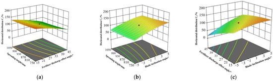 Factor interaction response surface diagram: (a) Spreading height and fertilizer discharge offset angle; (b) Spreading height and blade inclination angle; (c) Fertilizer discharge offset angle and blade inclination angle.