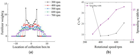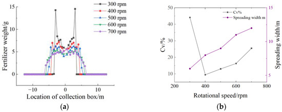 Further analysis revealed that, at lower rotational speeds, the centrifugal force was insufficient, causing shorter fertilizer particle flight times, higher particle concentration, and increased distribution variation. At higher rotational speeds, the centrifugal force caused excessive fertilizer particle dispersion [28], thereby increasing Cv. Thus, the optimal balance was found at a disc rotational speed of 400 rpm, yielding the lowest variation coefficient (Cv = 8.82%) and an optimal spreading width of 10 m, meeting the relevant agricultural machinery standards.