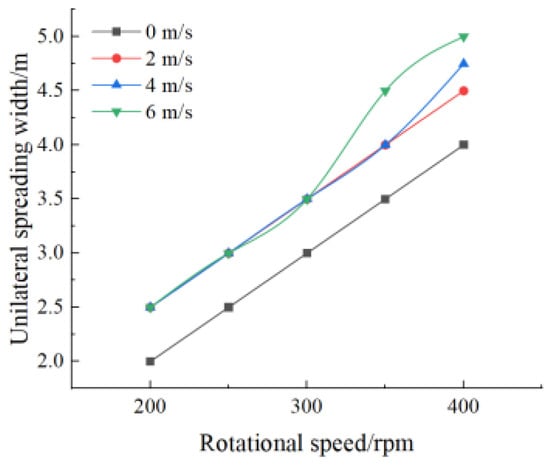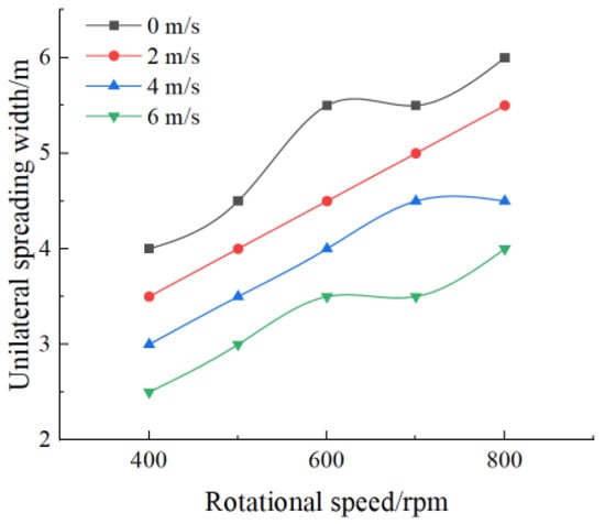 At wind speeds of 0–2 m/s, increasing the headwind spreading disc’s rotational speed led to a steady increase in single-sided spreading width. At wind speeds of 2–6 m/s, increasing the headwind spreading disc’s rotational speed induced fluctuations in single-sided spreading width. As the headwind spreading disc’s rotational speed increased, the influence of wind speed on single-sided spreading width diminished. At fixed rotational speeds, increasing wind speeds generally reduced spreading width.