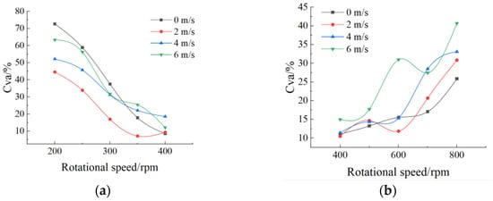Under tailwind conditions, as rotational speeds decreased from 400 rpm to 200 rpm, the single-sided Cva increased progressively. Specifically, when rotational speeds ranged from 350 rpm to 400 rpm, Cva remained stable; however, at speeds below 350 rpm, significant increases in Cva were observed.