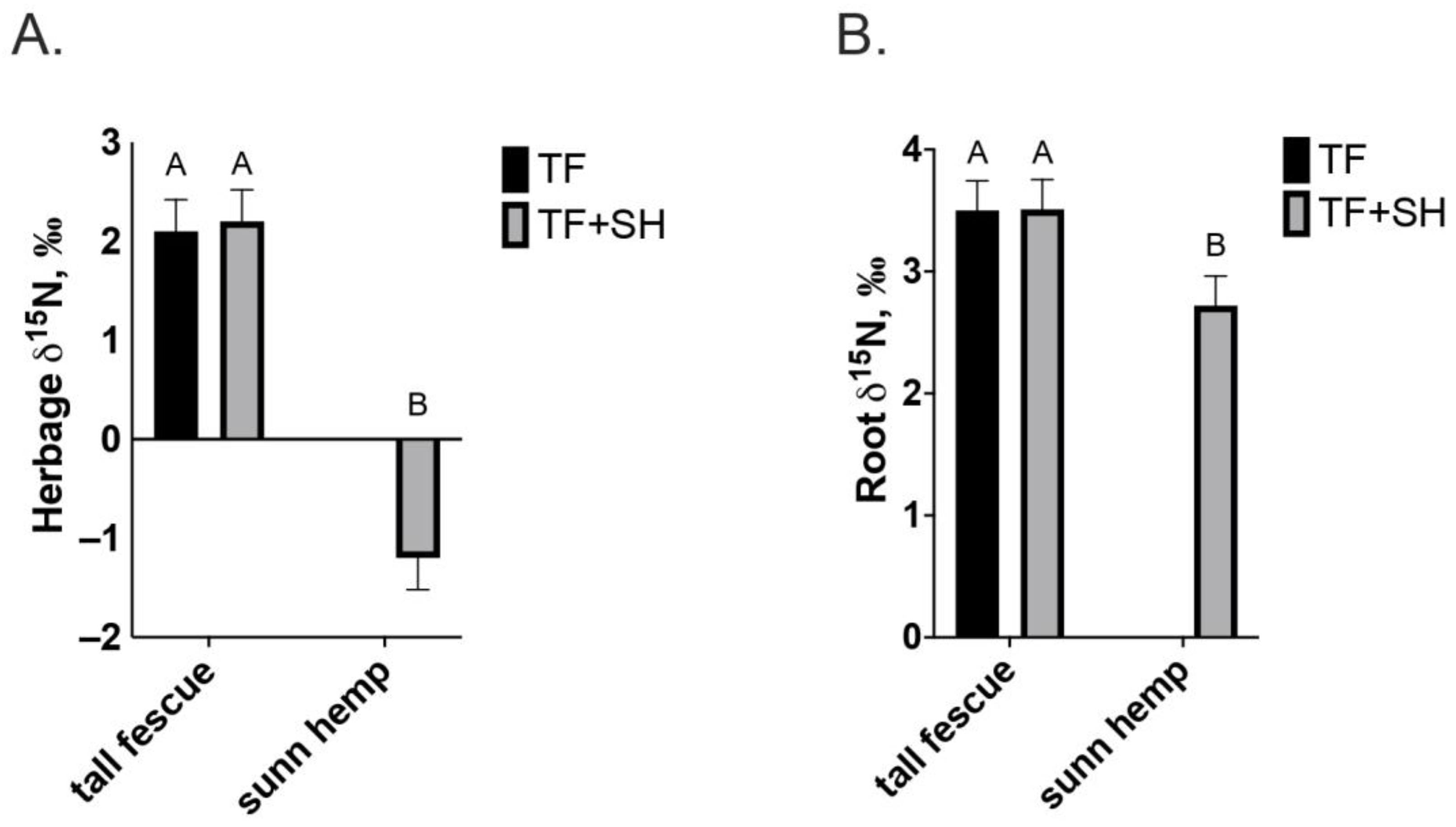 - Ashworth, A.J.; West, C.P.; Allen, F.L.; Keyser, P.D.; Weiss, S.A.; Tyler, D.D.; Taylor, A.M.; Warwick, K.L.; Beamer, K.P. Biologically Fixed Nitrogen in Legume Intercropped Systems: Comparison of Nitrogen-Difference and Nitrogen-15 Enrichment Techniques. Agron. J. 2015, 107, 2419–2430. [Google Scholar] [CrossRef]