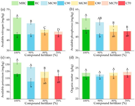 Effects of different treatments on soil chemical properties: (a) available nitrogen, (b) available phosphorus, (c) available potassium, and (d) organic matter. Uppercase letters denote significant differences between fertilizer application rates under inoculant-treated conditions, while lowercase letters indicate significant differences between fertilizer application rates under non-inoculant conditions, ANOVA, p < 0.05.