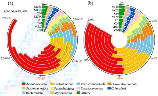 To determine the types and quantities of bacteria in the samples accurately, absolute and relative quantification tests were conducted on samples from eight treatments. The results at the phylum level are shown in Figure 2. Figure 2a demonstrates that among the four treatments without microbial agents, C90 exhibits the highest bacterial count at 2.98 × 107. In contrast, among the four treatments with microbial agents, MC80 shows the highest bacterial count, reaching 3.84 × 107. The ranking of bacterial quantities across all treatments is as follows: MC80 > MC70 > C90 > MC90 > RC > C70 > MRC > C80, indicating that reducing fertilizer application and supplementing with microbial agents can increase bacterial populations in the soil. Specifically, compared to C80, MC80 shows an increase of 80.29%, and compared to C70, MC70 shows an increase of 31.26%. However, when fertilizer application is high, the bacterial count in MRC decreases by 9.83% compared to RC, and MC90 decreases by 3.24% compared to C90.