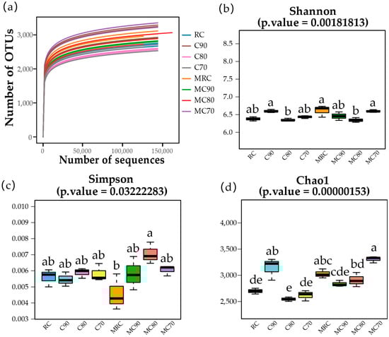 To observe the microbiome shifts of soils before and after microbial agent application, a total of 24 rhizosphere soil samples collected from the eight treatments (RC, C90, C80, C70, MRC, MC90, MC80, MC70) were sent to G&C Biotechnology Co., Ltd., Shanghai, 201315 (China), for absolute quantification 16S rRNA amplicon sequencing by Miseq. The total genomic DNA was extracted using the FastDNA® SPIN Kit for Soil DNA Extraction (MP Biomedicals, Santa Ana, CA, USA) according to the manufacturer’s instructions. The integrity of genomic DNA was detected through agarose gel electrophoresis, and the concentration and purity of genomic DNA were detected via Qubit 3.0 Spectrophotometer (Purchased from Thermo Fisher Scientific, Waltham, MA, USA). The V3-V4 hypervariable regions of the 16S rRNA gene and spike-ins were amplified with the primers 341F (5′-CCTACGGGNGGCWGCAG-3′) and 805R (5′-GACTACHVGGGTATCTAATCC-3′) [34]. The PCR amplification reaction was performed in triplicate in a total volume of 10 μL. The reaction mixture consisted of 1 μL of 10 × Toptaq Buffer, 0.2 μL of Toptaq DNA Polymerase, 0.2 μL of each primer (10 μM), and 3 μL of template DNA. Microbial diversity metrics were obtained on 19 June 2024.