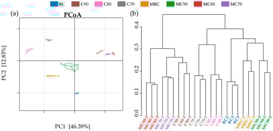 (a) Principal coordinate analysis (PCoA) and (b) hierarchical cluster tree of bacterial communities (calculated on Bray–Curtis).