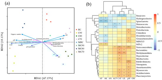 Analysis of the correlation between bacterial communities under different treatments, environmental factors, and dominant bacterial phyla reveals that the distances between the C90, MC80, and MC70 treatments are relatively close. This indicates a similarity in the structure of bacterial communities among these three groups, which aligns with the results depicted in Figure 4b. Additionally, the direction of the environmental variable arrows in Figure 5a corresponds with the colors and significance levels in the heatmap (Figure 5b), revealing the correlation between these chemical indicators and microbial taxa. The bacterial communities from these three groups show a positive correlation with various soil enzyme activities and a negative correlation with soil available nutrients. Based on the absolute quantification of bacteria shown in Figure 2, it is reasonable to speculate that the higher bacterial count leads to increased enzyme activity, enhancing the ability to activate soil and exogenous nutrients. This, in turn, promotes plants’ absorption of more available nutrients during their growth.