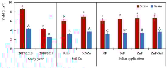 Effect of the main factors: “year (Y)”, “soil Zn application (S)”, and “foliar application (F)” on both straw and grain yields. Bars indicate means (n = 4) and error bars, the standard error. Within each factor, different letters mean (lowercases for straw and uppercases for grain) significant differences between means according to the LSD test (p ≤ 0.05).