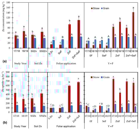 Zn concentration (a) and Zn uptake (b) in straw and grain as affected by the main effects ‘year (Y)’, ‘soil Zn application (S)’, ‘foliar application (F)’, and by the interaction ‘Y × F’. Bars indicate means (n = 4) and error bars, the standard error. Within each factor and plant part, different letters (lowercase for straw and uppercase for grain) mean significant differences between means according to the LSD test (p ≤ 0.05).