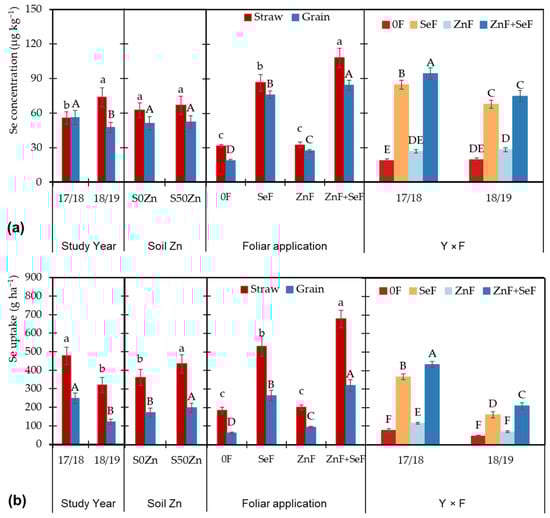 Concentration of Se (a) and total Se content (b) in the straw and grain as affected by the main effects ‘year (Y)’, ‘soil Zn application (S)’, ‘foliar application (F)’, as well as the effect of the interaction ‘Y × F’ in the grain. Bars indicate means (n = 4) and error bars, the standard error. Within each factor and plant part, different letters (lowercase for straw and uppercase for grain) mean significant differences between means according to the LSD test (p ≤ 0.05).