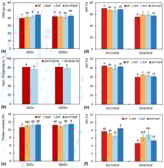 The combined ZnF + SeF, application, regardless of whether Zn was applied to the soil or not, produced the highest 1000 grains weights, with no significant differences among the other foliar treatments in the 50SZn treatment (Figure 4a). The hectoliter weight was observed to be higher in both years when Zn was not applied to the soil (Figure 4b). With regard to the fibers, the percentages of NDF, ADF, and ADL were lower in the second year, with lower values in ZnF in 2017/18 and in the control in 2018/19. However, these values remained within a similar range to those observed in the other foliar treatments studied (Figure 4d–f).
