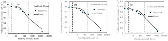 (a–c) Fitted and measured soil water retention curves for arable land in the 0–10, 10–20, and 20–30 cm layers at the University of Venda. The dotted lines represent the size separation of soil pores according to Luxmore [30].