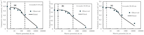 (a–c) Fitted and measured soil water retention curves for the avocado orchard in the 0–10, 10–20, and 20–30 cm at the University of Venda. The dotted lines represent the size separation of soil pores according to Luxmore [30].