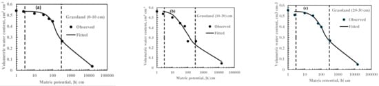 (a–c) Fitted and measured soil water retention curves for the grassland in the 0–10, 10–20, and 20–30 cm layers at the University of Venda. The dotted lines represent the size separation of soil pores according to Luxmore [30].