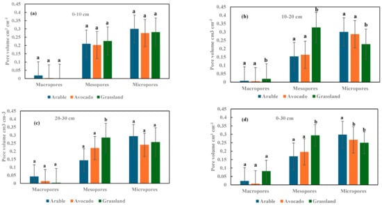 (a–d) Soil pore volumes of macro-, meso-, and micropores of the arable land, avocado orchard, and grassland in the 0–10, 10–20, 20–30, and 0–30 cm layers at the University of Venda. Macropore volume was calculated as the difference between volumetric water contents at matric potentials between h = 0 (saturation) and |h| < 3 cm; mesopores were calculated as the difference between volumetric water contents at matric potentials of |h| = 3–300 cm; and micropore volume was calculated as the remainder from total porosity. Vertical bars denote standard error bars. Different letters within the same pore size are significantly different at p ≤ 0.05 according to Fischer’s LSD test.