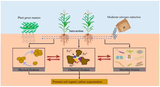 The chemical fixation mechanism mainly involves chemical binding between organic carbon and soil minerals [95,96]. After applying green manure, the organic matter produced during plant growth reacts with soil minerals to form organic–inorganic complexes [97]. Research has shown that the formation of these complexes significantly improves the stability of soil organic carbon, reduces the mineralization rate of organic carbon, and enhances the soil’s carbon storage capacity [21,98]. At the same time, moderate nitrogen application can improve soil chemical properties and increase the effectiveness of nutrients in soil, and this improvement in nutritional conditions can promote the growth and metabolic activity of microorganisms [99], thereby enhancing the formation of organic–inorganic complexes. In addition, under the condition of returning green manure to the field, moderate nitrogen reduction can promote the transfer of soil light organic carbon to aggregated particle organic carbon [100], drive the enrichment of free iron and amorphous iron in the aggregated structure [101], increase the content of fatty organic carbon, carboxylic acid state, and aromatic organic carbon in various particle size aggregates of soil, increase the relative ratio of aromatic carbon/fatty carbon and carboxylic acid carbon/fatty carbon in each aggregate [27], increase clay mineral adsorption sites [102], improve soil carbon stability, and green manure can enhance the interaction between soil biota and non-biota, which is also beneficial for the formation and stability of soil organic carbon. In addition, the application of green manure can usually improve the pH value and cation-exchange capacity of soil [103], thereby creating a favorable chemical environment for long-term storage of organic carbon. It can be seen that the combination of green manure and nitrogen fertilizer should be fully considered in agricultural production to achieve the best soil carbon sequestration effect. Most notably, recent studies highlight that root architectural traits of green manure species significantly modulate SOC sequestration patterns. Deep-rooting legumes (e.g., alfalfa) exhibit greater potential for subsoil carbon storage through root-derived particulate organic matter [104], whereas shallow-rooting species (e.g., clover) predominantly enhance rhizodeposition in topsoil [105]. Particularly, the composition of root exudates (e.g., carboxylates vs. phenolics) varies across species, differentially stimulating microbial necromass accumulation—a key precursor for mineral-associated organic matter formation. This suggests that green manure selection should consider root trait characteristics to target specific soil carbon pools. Of course, there is never a single mechanism for organic carbon stabilization. For example, green manure incorporation enhances soil organic matter stabilization through interconnected physical and chemical mechanisms. The decomposition process simultaneously promotes physical encapsulation within soil aggregates and chemical binding to mineral surfaces, particularly iron/aluminum oxides and clay particles, and released organic compounds act as both binding agents for aggregate formation and substrates for mineral adsorption.