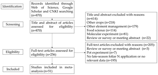 Following the data integration requirements of the meta-analysis methodology and the objectives of this study, the following selection criteria were applied: (i) the study must report field experiments comparing late-season foliar N application with a control treatment (no late-season foliar N application); (ii) the study must include or allow for the estimation of mean values and sample sizes for at least one response variable (e.g., wheat yield, grain protein concentration). In addition to the grain yield and grain protein concentration, we also extracted wheat type, total N rate, late-season foliar N application timing, and late-stage foliar N application ratios (the proportion of late-stage foliar N application to total N application). (iii) Late-season N application must be applied exclusively through foliar spraying, without additional soil-based topdressing during the later growth stages. (iv) The study must not combine N treatments with plant growth regulators, nitrification inhibitors, or other agrochemicals that could confound the results. (v) The study must apply conventional foliar N fertilizers and not include nanofertilizers. If data were presented in graphical format, the GetData Graph Digitizer (version 2.25, Russian Federation) was used for data extraction. In total, 51 studies comprising 1498 paired observations were included in the final dataset for statistical analysis.
