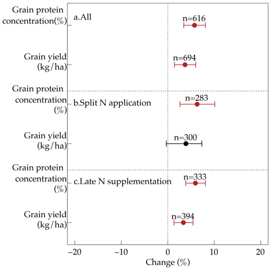 Comprehensive effects of late-season foliar N application on grain yield and quality for all (a), split N application (b), and late N supplementation (c) datasets. Data points represent treatment means, and horizontal bars indicate 95% confidence intervals. Numbers denote the number of observations used for statistical analysis. Red points indicate statistically significant effects, while black points indicate non-significant effects.