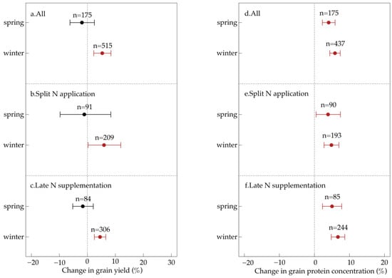 Comprehensive effects of late-season foliar N application on grain yield (a–c) and quality (d–f) of winter and spring wheat. Data points represent treatment means, and horizontal bars indicate 95% confidence intervals. Numbers denote the number of observations used for statistical analysis. Red points indicate statistically significant effects, while black points indicate non-significant effects.