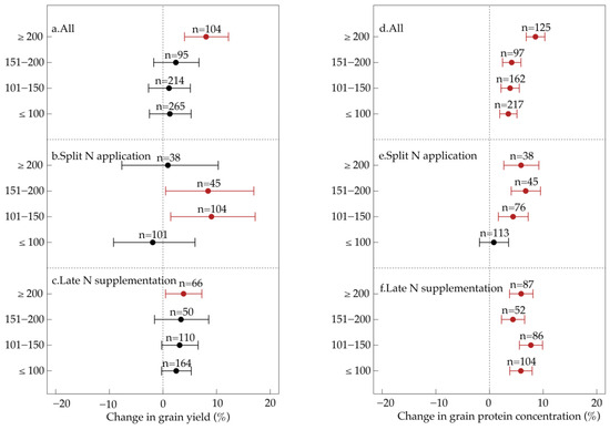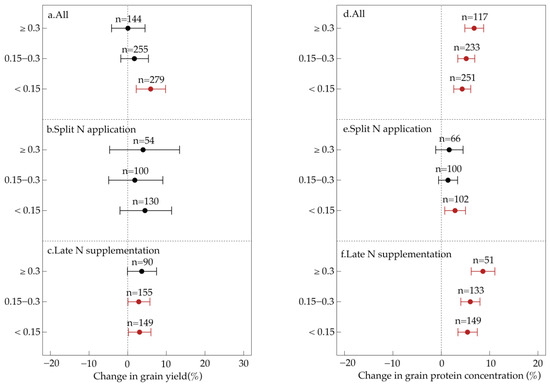 Impact of late-season foliar N application on wheat grain yield (a–c) and quality (d–f) at different N application rates. Data points represent treatment means, and horizontal bars indicate 95% confidence intervals. Numbers denote the number of observations used for statistical analysis. Red points indicate statistically significant effects, while black points indicate non-significant effects.