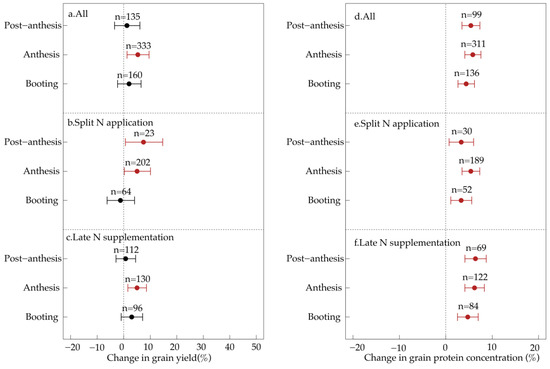 Effects of late-season foliar N application on wheat grain yield (a–c) and quality (d–f) at different application timings. Data points represent treatment means, and horizontal bars indicate 95% confidence intervals. Numbers denote the number of observations used for statistical analysis. Red points indicate statistically significant effects, while black points indicate non-significant effects.