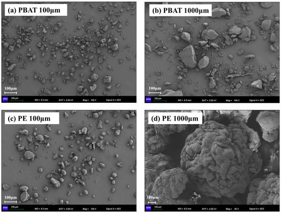 Scanning electron microscopy images of the PBAT (polybutylene adipate terephthalate) of 100 μm (a) and 1000 μm (b) particle sizes; PE (polyethylene) of 100 μm (c) and 1000 μm (d) particle sizes.